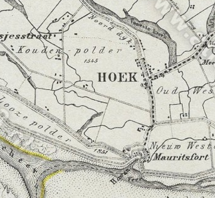 Hoek ontstond in de 17e eeuw. In 1542 werd de Lovenpolder ingedijkt. In 1545 volgde de Koudenpolder en in 1616 de Oud-Westenrijkpolder. Op de hierdoor ontstane driesprong van dijken ontwikkelde zich Hoek. In 1588 werd het Mauritsfort opgericht, aan de oever van de Braakman, ten zuiden van de huidige kom, tegenover de vesting Philippine, die toen in Spaanse handen was en pas in 1633 door de Staatsen werd veroverd. In 1665 werd het door de aanleg van de Nieuw-Westenrijkpolder met het grondgebied van Hoek verbonden. Het fort deed overigens na de verovering van Philippine en de Vrede van Münster (1648) geen dienst meer en raakte in verval. In het wapen van Hoek is het Mauritsfort afgebeeld. Hoek behoorde vanouds tot het Land van Axel, en is als zodanig overwegend protestants geworden. Tot de gemeentelijke herindeling in 1970 was Hoek een zelfstandige gemeente. Binnen deze voormalige gemeente lag ook het voormalige dorp Vingerling.